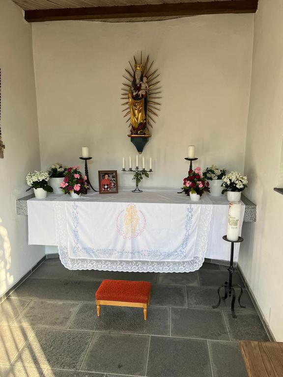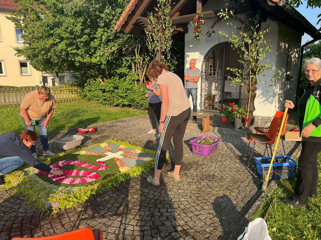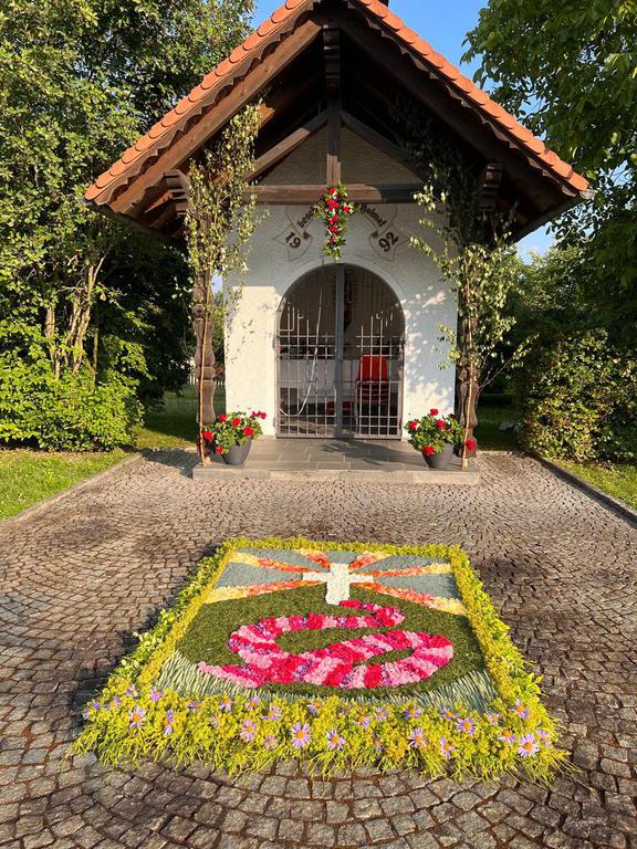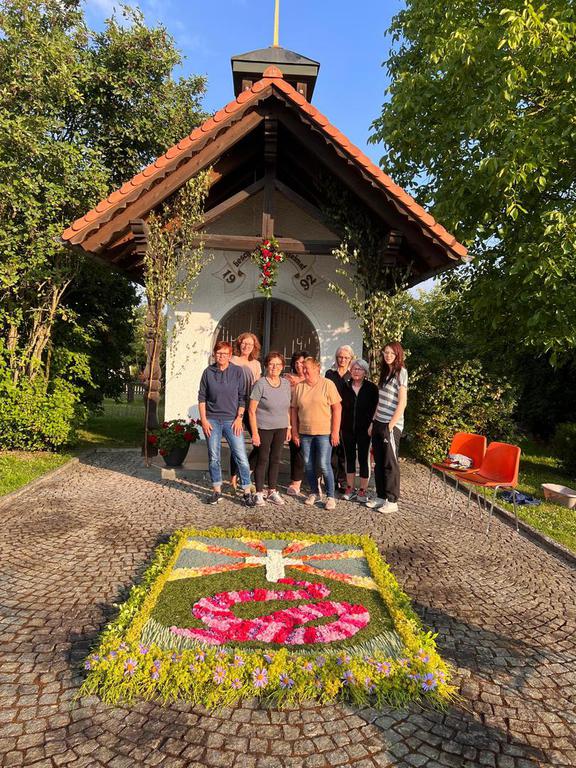 Nach dem wetterbedingten Ausfall im letzten Jahr erstrahlte der Blumenteppich zur Fronleichnams-prozession an der Kapelle in Thann in