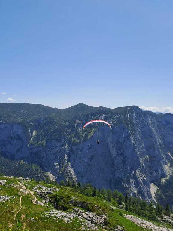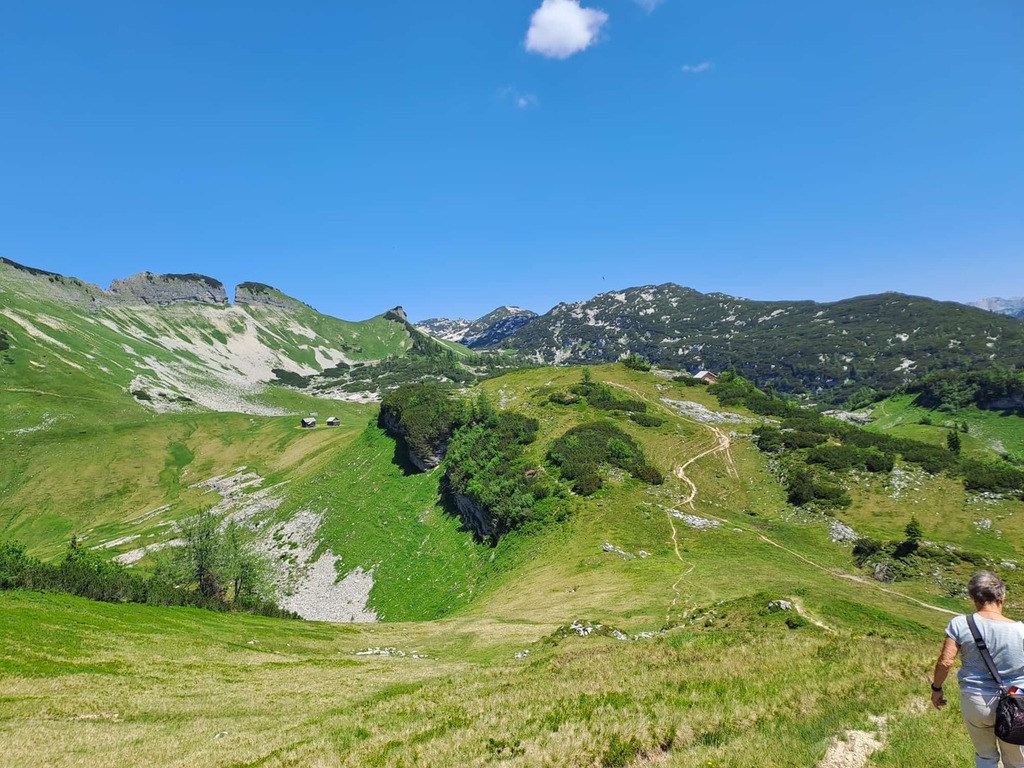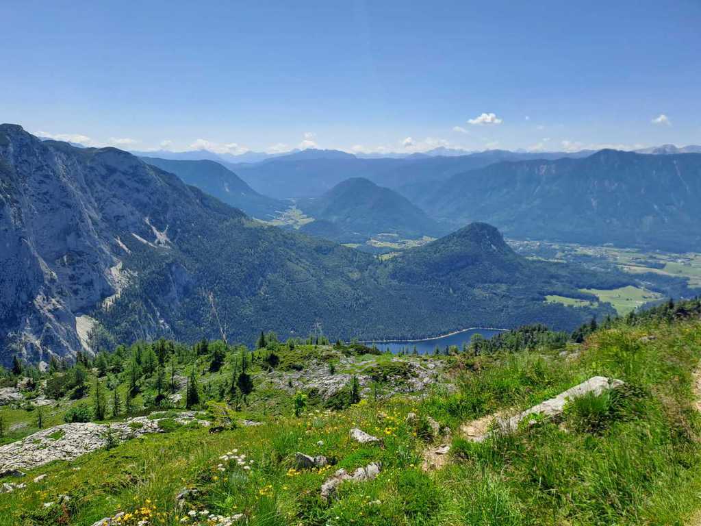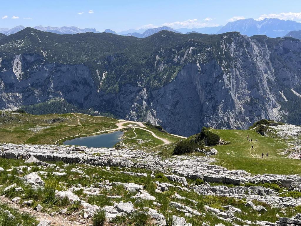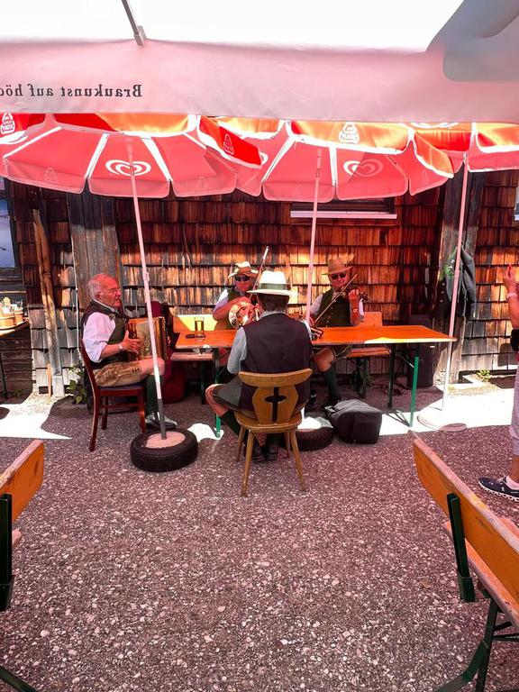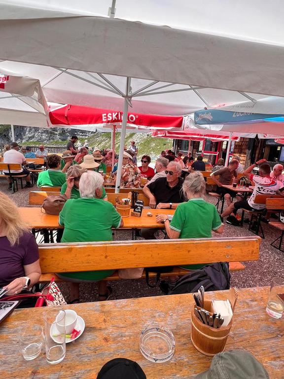 Der Rückweg führte durch einen anspruchsvollen Felskamin, bei dem die Hände zum Vorankommen gebraucht wurden. Danach wurde die Gruppe auf der Terrasse der Loser Alm mit leckerem Essen und Musik (Danzlmusi) verwöhnt, während sie zum Ausklang des Ausflugs den herrlichen Ausblick auf die Bergwelt und das Dachsteinmassiv genoss.