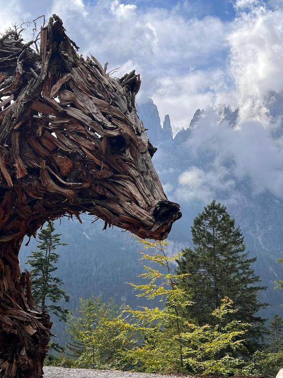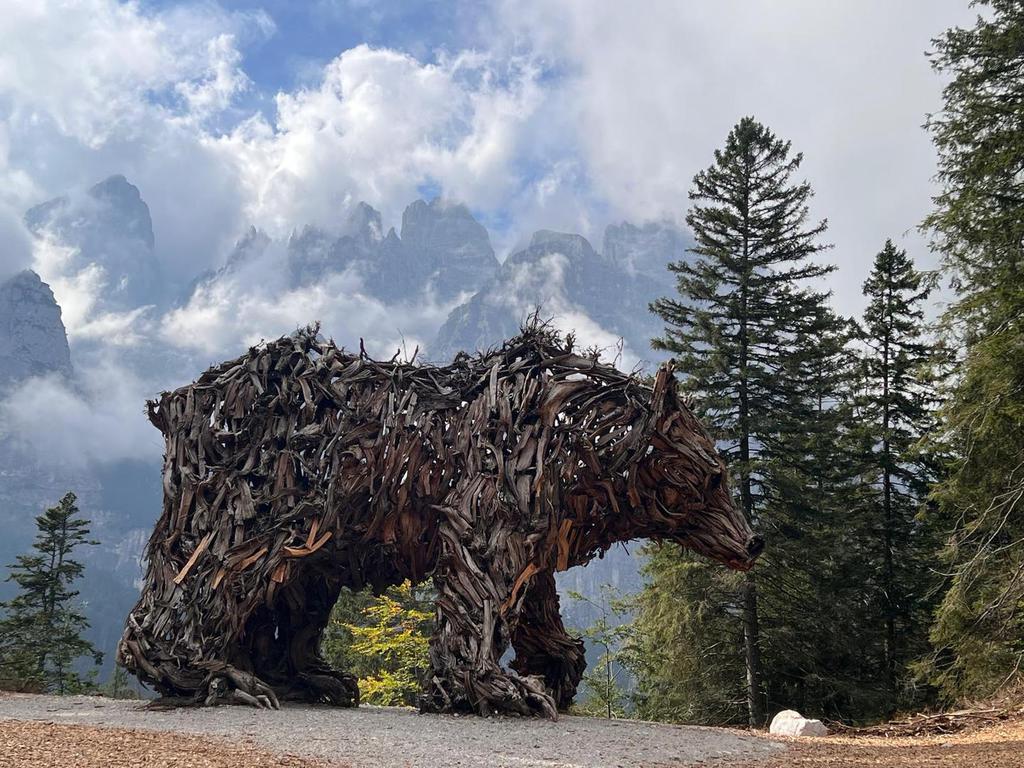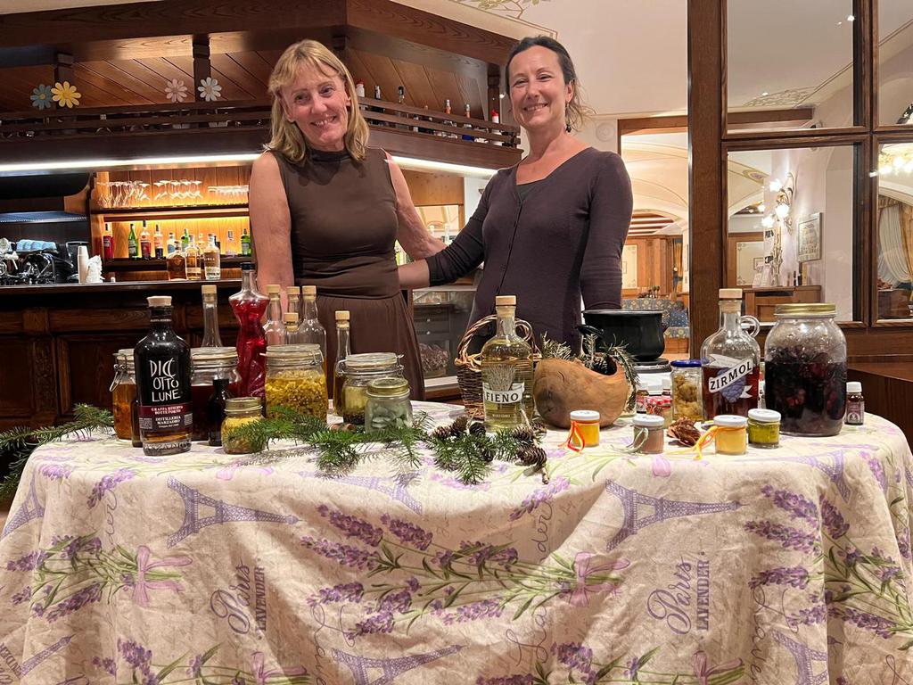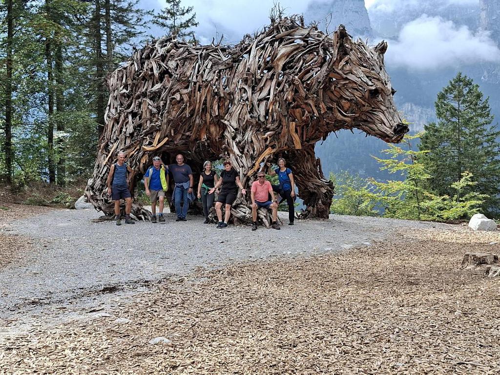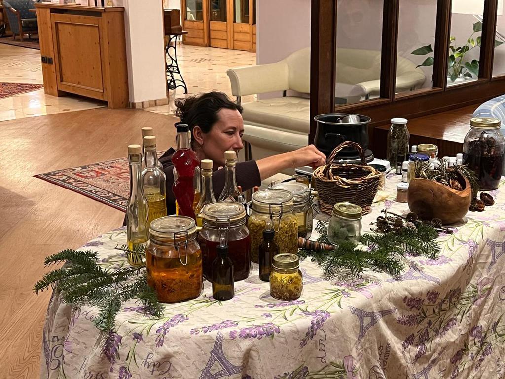 Am zweiten Tag Fahrt mit der Kabinenbahn direkt von Molveno hinauf auf den Pradèl (1.350 m) im Herzen des Adamello-Brenta-Naturparks. Von hier aus hat man einen wunderbaren Ausblick auf das Tal von Molveno und seinen wunderschönen See ebenso wie auf die traumhafte Kulisse der Brenta-Dolomiten. Ein Teil der Gruppe begab sich mit dem Wanderführer Marco zum Rifugio Croz dell’Altissimo (1.480 m). Ein Highlight auf dieser Wanderung war der Bär von Pradèl: Ein Kunstwerk aus Holz aus 2.000 Lärchenwurzeln, 6 Meter hoch und 8 Meter lang. Es lädt dazu ein, über das empfindliche Gleichgewicht des Zusammenlebens mit den Bären nachzudenken. Der andere Teil der Gruppe begab sich mit Alessandra und Deborah auf eine geführte Heil- und Wildkräuter Tour. Die Gruppe erfuhr viel über die verschiedenen Heil- und Wildkräuter in diesem Berggebiet und deren Bedeutung für die Gesundheit. Nach dem Abendessen führte uns Deborah in angewandte Heil- und Kräuterkunde ein, vor unseren Augen erwärmte sie Bienenwachs und mischte verschiedene Kräuterauszüge und ätherische Öle unter. Ferner zeigte sie uns, wie man Blüten, Kräuter, Weißtannenspitzen, Zirbenzapfen etc ansetzt.